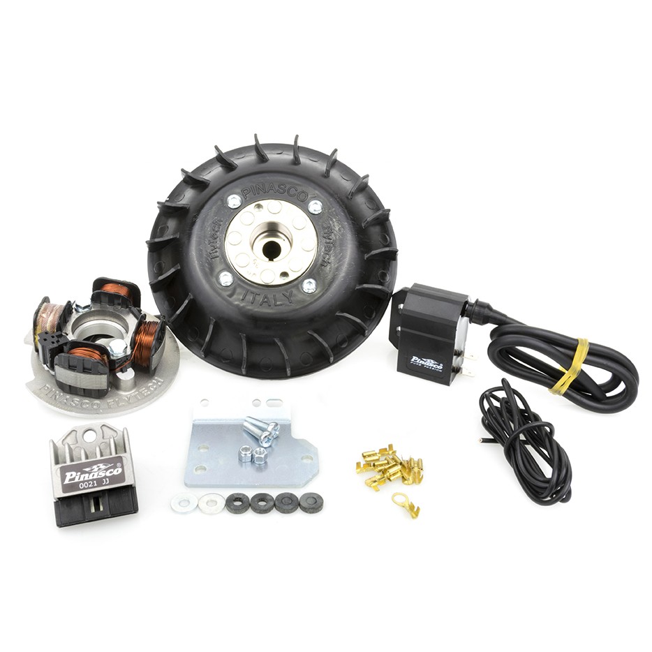 L'accensione ad anticipo variabile PINASCO FLYTECH è frutto di innumerevoli ricerche e sviluppi volti a realizzare un prodotto di altissima qualità affidabile e duraturo nel tempo. Il Volano PINASCO FLYTECH è stato realizzato con differenti pesi per tutti i modelli di Vespa VNB-GT-LML-COSA-SPRINT-PX-GS-FARO BASSO. I pesi dei volani sono di 0.9kg, 1.1kg, 1.4kg, 1,6kg e 1,8kg, con l'aggiunta della ventola Pinasco ricavata dal pieno o in fusione è possibile aumentare il peso di altri 0.2kg.