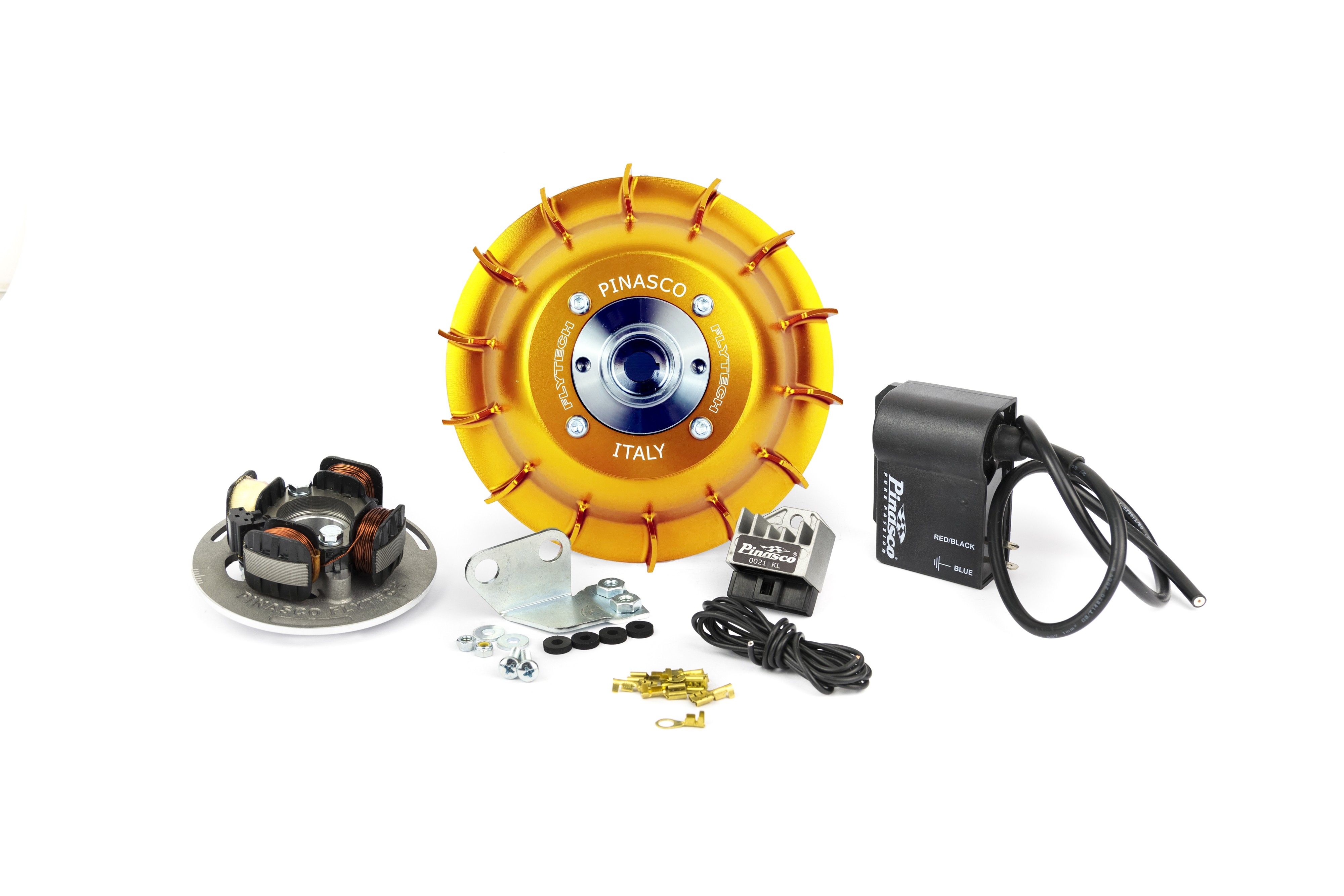 L'accensione Pinasco Flytech Racing è equipaggiata di centralina Pinasco “Sparkey”ad alto voltaggio e fornita con rotori lavorati a controllo numerico ricavati dal pieno.