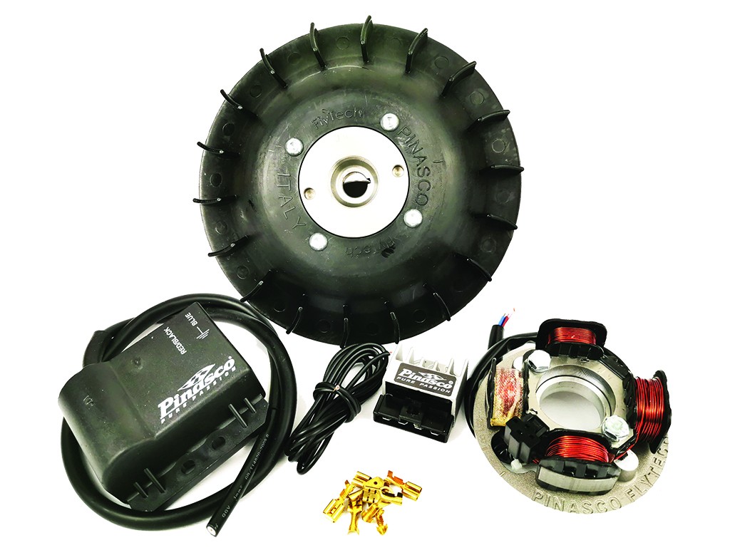 L'accensione Pinasco Flytech Racing è equipaggiata di centralina Pinasco “Sparkey”ad alto voltaggio e fornita con rotori lavorati a controllo numerico ricavati dal pieno.