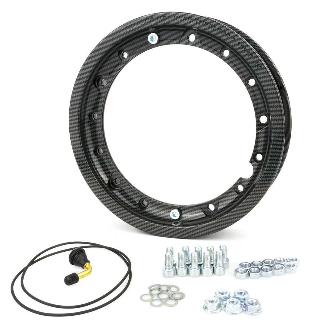 Cerchio ruota Verniciato Carbon Look in lega leggera tubeless scomponibile, cioè con la possibilità di essere aperto per la sostituzione del pneumatico, per tutte le Vespa con ruote 10". Il cerchio Tubeless Scomponibile Pinasco ha un canale 2.10 perfettamente centrato al telaio Vespa così da mantenere il massimo della stabilità sia sulle Vespa Large frame che Small frame.
