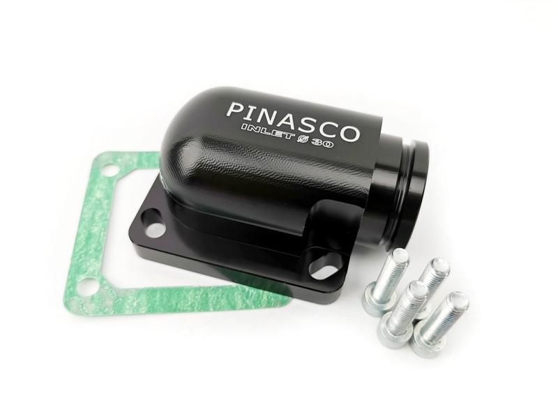 Collettore diametro 30mm in alluminio anodizzato nero full CNC per tutti i supporti lamellari che montano pacchi lamellari tipo RD350, può essere usato con pacchi lamellari 8X Pinasco e V-Force, monta su tutti i Carter Slave Pinasco, realizzato per poter montare carburatori Dell'Orto PHBH e Carburatori PWK.
