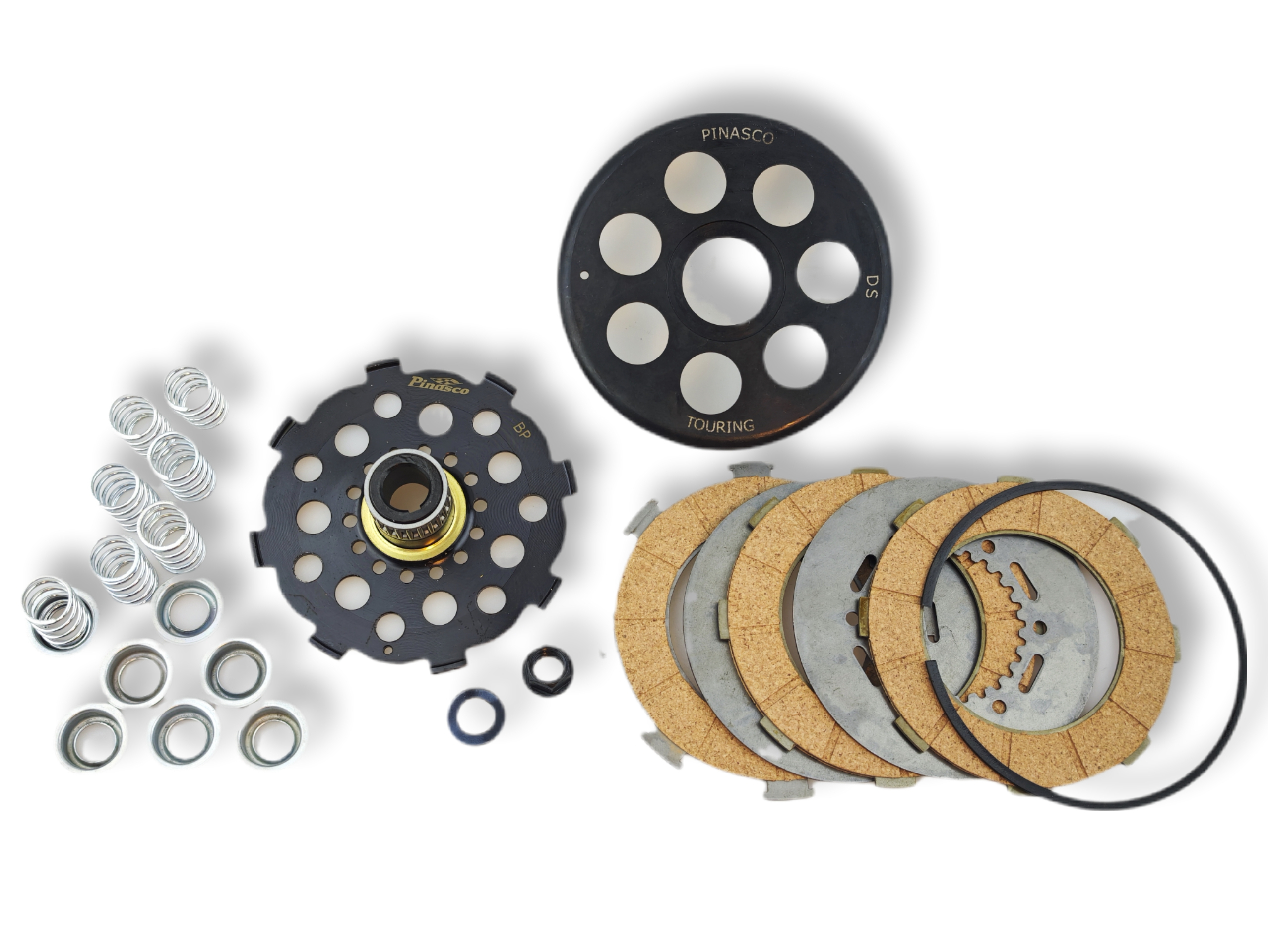 Il kit Pinasco Power Clutch raccoglie tutti i componenti Pinasco dedicati alle frizioni per Vespa Large Frame in un unico e completo kit intercambiabile al 100% con l'originale.