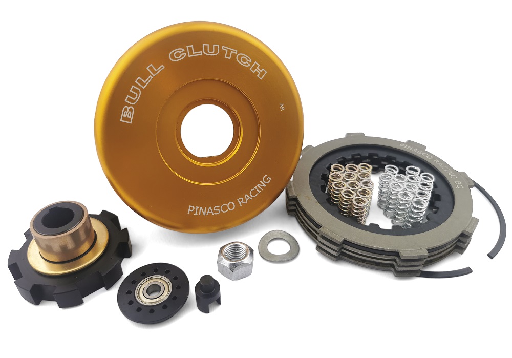 "La frizione Pinasco Racing E-Bull Clutch per Vespa Large frame è composta da una campana a 12 molle in Ergal anodizzato ad alta resistenza e da un sistema di innesto totalmente ricavati dal pieno, in grado di gestire la potenza trasmessa dall'albero motore al gruppo ingranaggi fino a 38CV di potenza. Il sistema di innesto boccolo/campana a ""coda di rondine"" evita il trascinamento dei dischi anche nelle condizioni di lavoro più gravose, il gruppo frizione Pinasco Bull Clutch è corredato da 2 tipi di molle con durezza differente per configurare il prodotto secondo le proprie esigenze. La frizione Pinasco Racing Bull Clutch viene fornita con bronzina e rasamento in ottone, monta dischi sinterizzati di derivazione motociclistica, il cuscinetto radiale ""Clutch Bearing"" e lo spingidisco adattivo in acciaio."