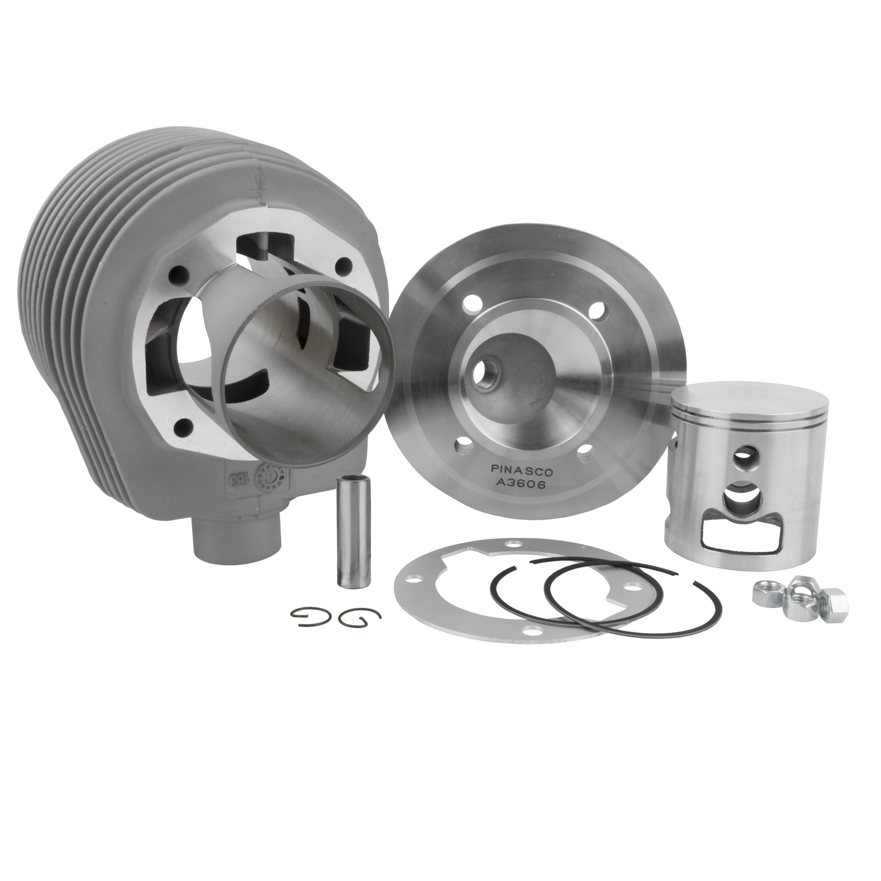 Gruppo termico Pinasco in alluminio 6 travasi per Vespa a 2 travasi, l'ideale per chi vuole dare un pò di brio al proprio veicolo. Il kit non necessita di particolari conoscenze tecniche per essere montato e si adatta facilmente a tutte le Vespa da 125 a 150, 3-4 marce senza bisogno di lavorazioni specifiche. Le caratteristiche tecniche di questo cilindro sono una notevole coppia e consumi ridotti, l'alluminio con riporto al Nicasil conferisce al gruppo termico Pinasco una robustezza eccezionale e una resistenza unica garantendo prestazioni superiori in tutti i regimi di utilizzo.