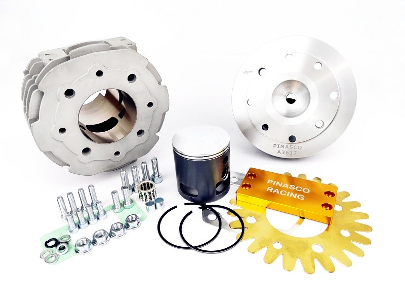 Gruppo termico racing per Vespa T5 realizzato in alluminio con riporto al Nikasil. Completamente modificato e rinnovato rispetto allo storico cilindro Pinasco per Vespa T5, presenta una nuova travaseria, uno scarico maggiorato con booster ed una testa con bussole di centraggio; per ridurre le temperature di esercizio viene fornita una speciale guarnizione della testa in ottone. Versione Master con aspirazione a valvola rotante.