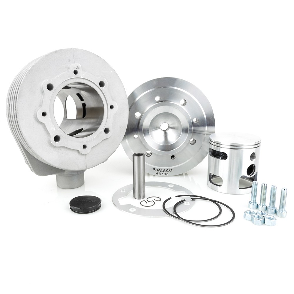 Gruppo termico Pinasco in alluminio 6 travasi per Vespa a 2 travasi, l'ideale per chi vuole dare un pò di brio al proprio veicolo. Il kit non necessita di particolari conoscenze tecniche per essere montato e si adatta facilmente a tutte le Vespa da 125 a 150, 4 marce senza bisogno di lavorazioni specifiche. Le caratteristiche tecniche di questo cilindro sono una notevole coppia e consumi ridotti, l'alluminio con riporto al Nicasil conferisce al gruppo termico Pinasco una robustezza eccezionale e una resistenza unica garantendo prestazioni superiori in tutti i regimi di utilizzo.