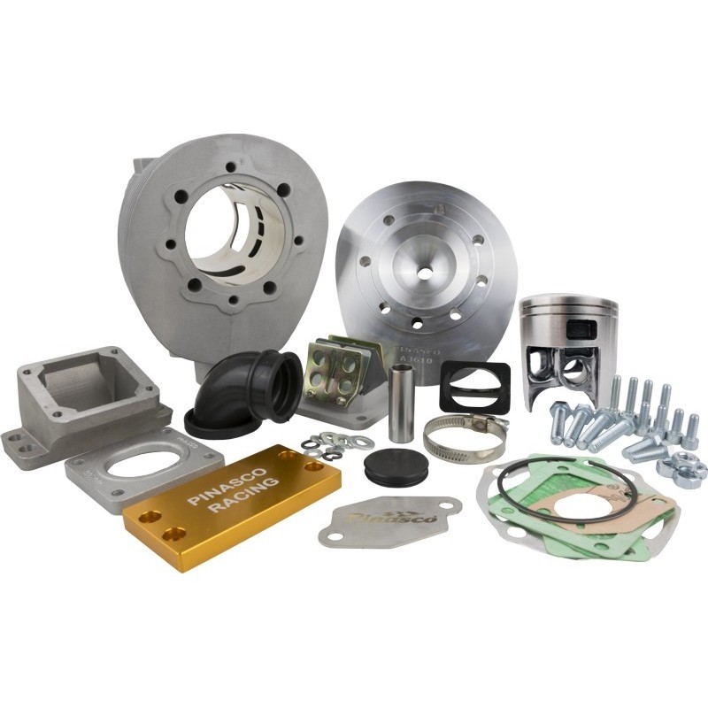 Il gruppo termico 225cc in alluminio 9 travasi è specifico per il montaggio con alberi motore corsa lunga 60mm. I cilindri sono realizzati in lega di alluminio con riporto al Nicasil che conferisce una robustezza eccezionale ed una resistenza unica garantendo prestazioni superiori a tutti i regimi di utilizzo. Questo gruppo termico è l'ideale per chi vuole un motore in corsa lunga ad alte prestazioni, il cilindro è completo di pacco lamellare tipo RD350 per poterlo usare "aspirato al cilindro"