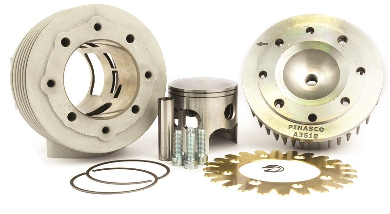 Gruppo termico racing per motori Pinasco 251cc Large e Small realizzato in alluminio con riporto al Nikasil, presenta una nuova travaseria, uno scarico maggiorato con booster ed una testa con bussole di centraggio a candela centrale; per ridurre le temperature di esercizio viene fornita una speciale guarnizione della testa in ottone.