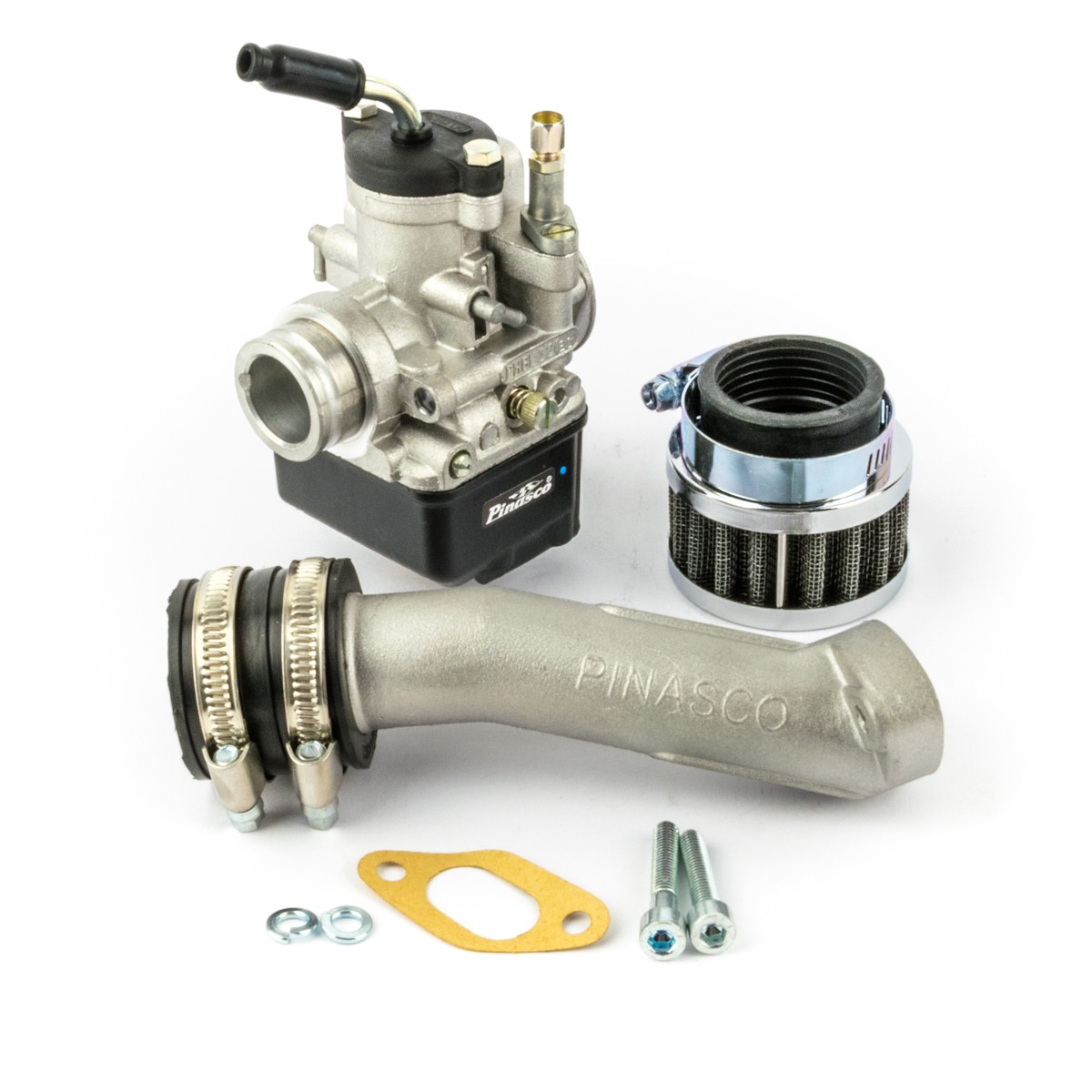 Impianto di alimentazione già tarato per le più classiche elaborazioni Pinasco con carburatori da 16 a 24 mm per Vespa Small completi di collettore, manicotto, fascette e accessori per il corretto montaggio.