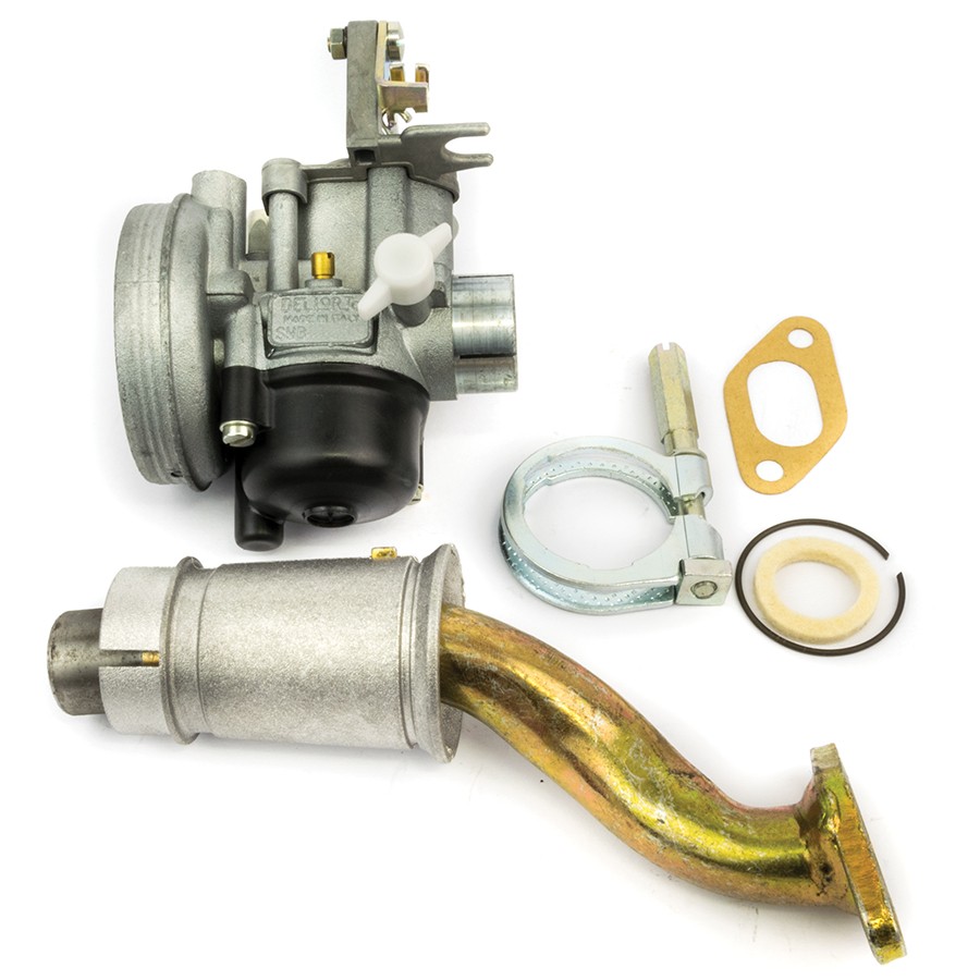 Impianto di alimentazione già tarato per le più classiche elaborazioni Pinasco con carburatori da 16 a 24 mm per Vespa Small completi di collettore, manicotto, fascette e accessori per il corretto montaggio.