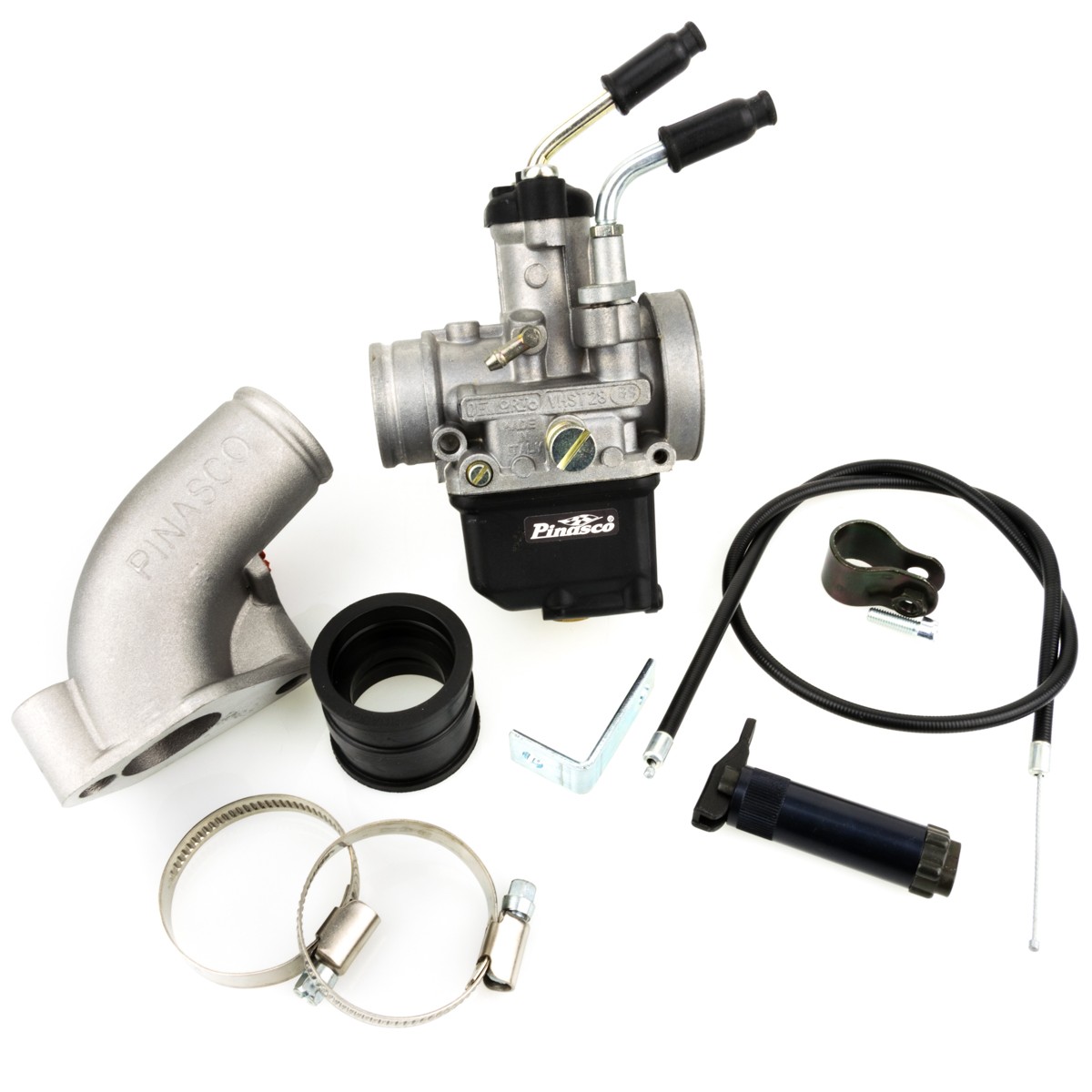 Impianto di alimentazione già tarato per le più classiche elaborazioni Pinasco con carburatori da 16 a 24 mm per Vespa Small completi di collettore, manicotto, fascette e accessori per il corretto montaggio.