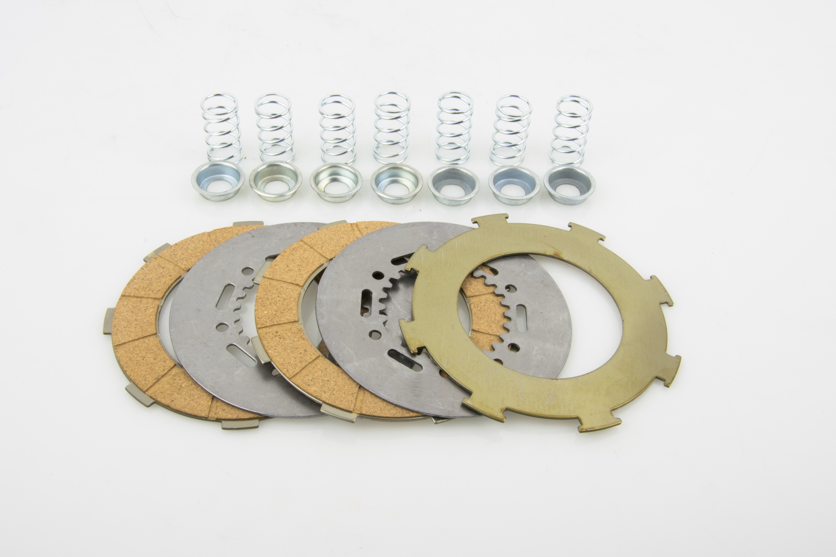 Il kit composto da dischi in sughero e acciaio, molle rinforzate e bicchierini forati compatibili con frizioni Pinasco Power Clutch e frizioni Piaggio.
