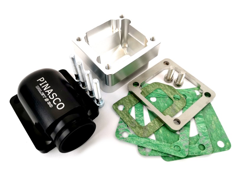 Ricavati dal pieno con lavorazione CNC, i collettori Pinasco si adattano a tutti i Carter Large frame con carburatori da 30mm a 34mm.