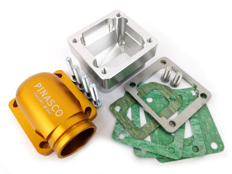 Ricavati dal pieno con lavorazione CNC, i collettori Pinasco si adattano a tutti i Carter Large frame con carburatori da 30mm a 34mm.