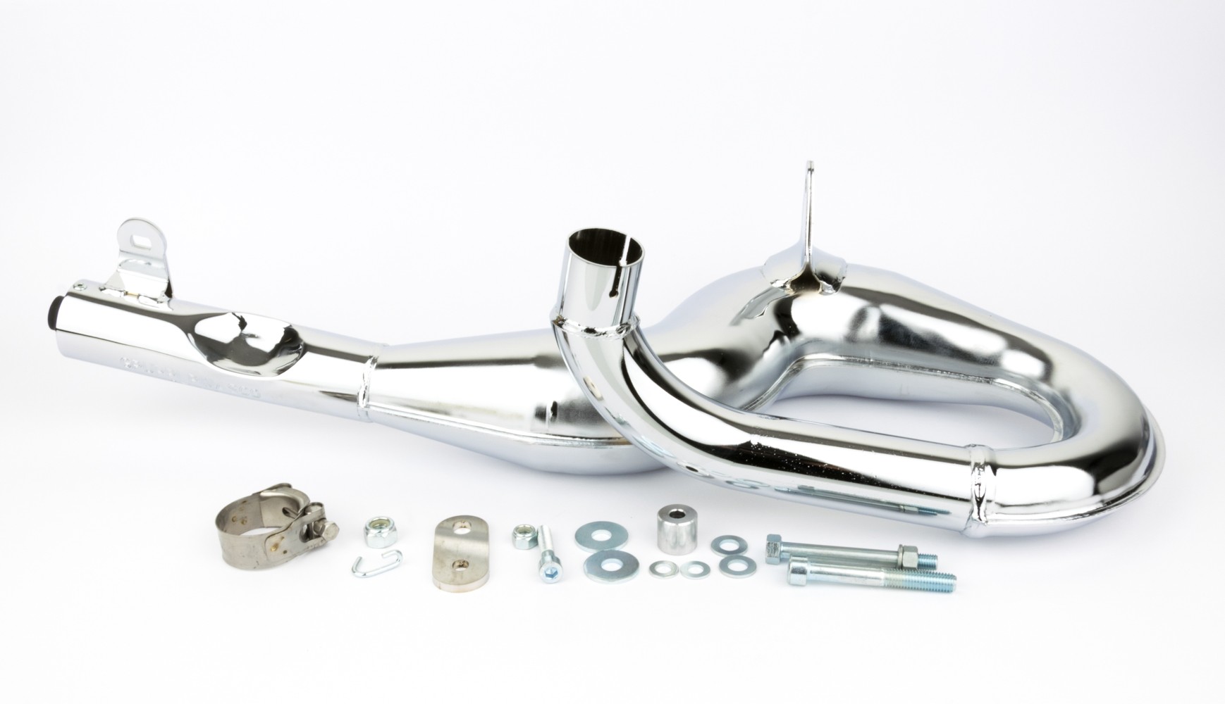 Scarico sportivo Pinasco per tutte le Vespa 125-150-200, realizzato per il perfetto funzionamento su tutte le Vespa con motore originale o equipaggiate con i nostri kit di preparazione, viene assemblato a mano e cromato a spessore.