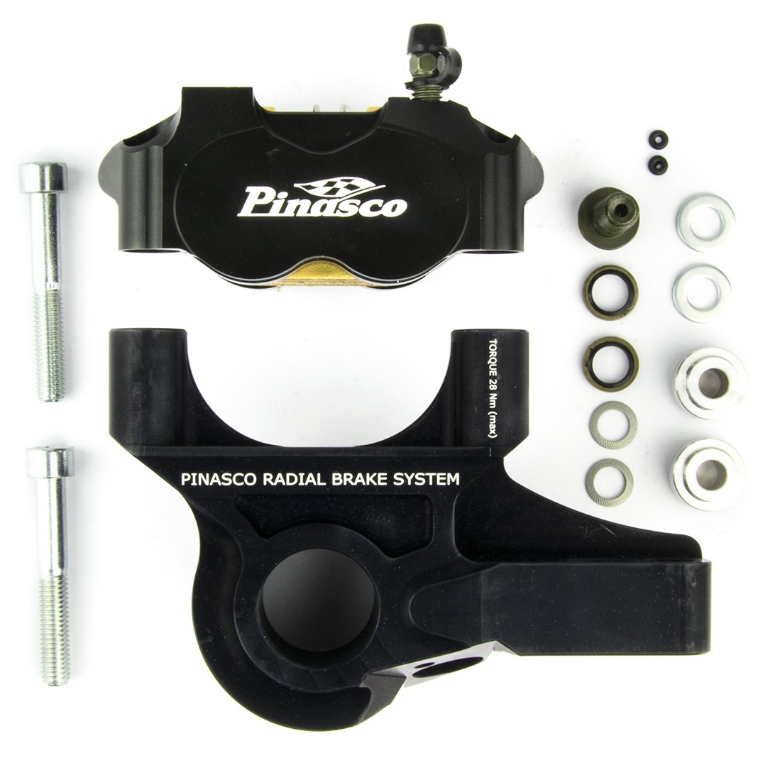 Ricavate dal pieno e sviluppate in pista e poi su strada, le Pinze Freno Radiali Pinasco dispongono di una pinza con 4 pistoncini che aumentano notevolmente la frenata del veicolo, il supporto pinza anc'esso ricavato dal pieno ha un interasse da 82mm, l'inclinazione della pinza verso il basso è voluta per aumentare la superficie esposta all'aria che ne raffredda l'olio anche negli usi più gravosi. Lo speciale sistema di spurgo con pistoncini indipendenti permette di eliminare velocemente le bolle d'aria ed eseguire cambi d'olio veloci e precisi. Il kit Pinasco Pinza a 4 pistoncini permette il montaggio dell'ingranaggio del contakm e può essere adattato a tutte le forcelle Vespa con perno da 20mm.