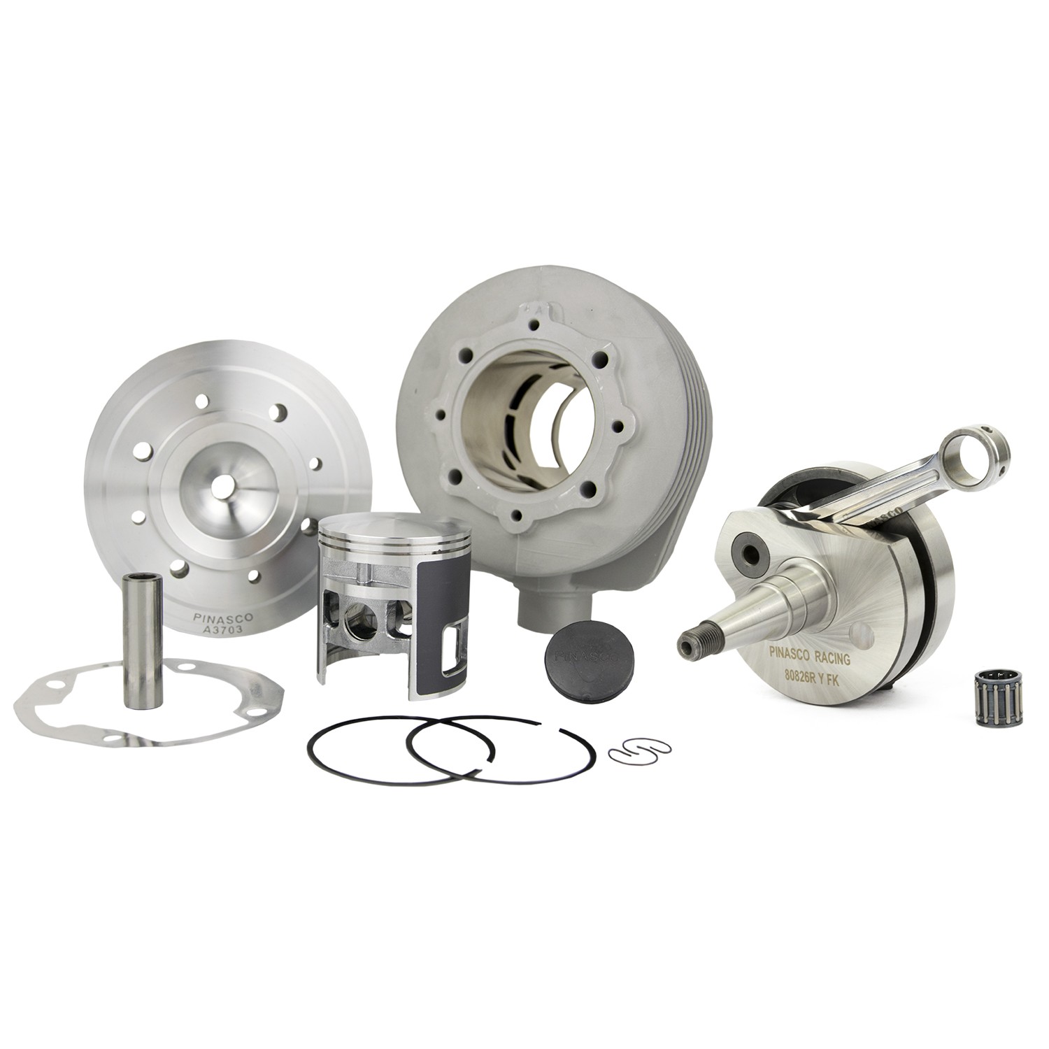 Gruppo termico Pinasco in alluminio 6 travasi con booster allo scarico per Vespa a 3 travasi, l'ideale per chi cerca un gruppo termico racing senza compromessi. Il kit è estremamente performante e si adatta facilmente a tutte le Vespa da 125 a 150, richiede la lavorazione dei travasi sul carter per ottenere il massimo delle prestazioni. Le caratteristiche tecniche di questo cilindro sono una notevole coppia e potenza, l'alluminio con riporto al Nicasil conferisce al gruppo termico Pinasco una robustezza eccezionale e una resistenza unica garantendo prestazioni superiori alla norma in tutti i regimi di utilizzo.