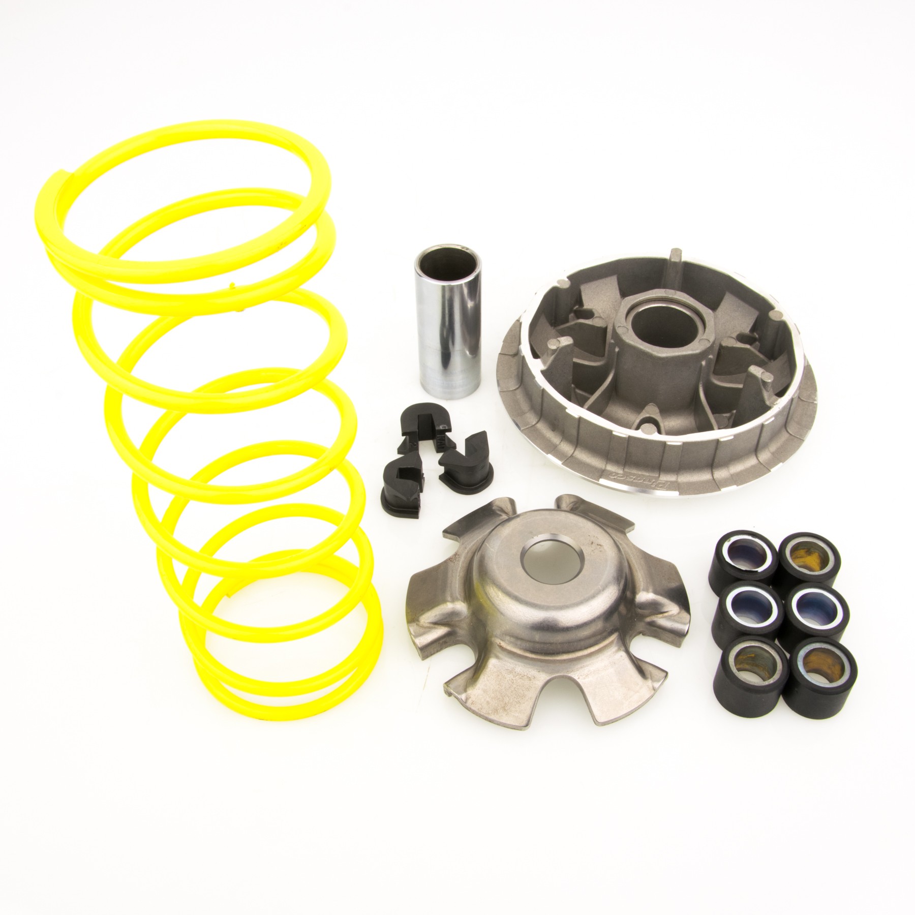 Frutto della raffinata tecnologia Pinasco, questi variatori permettono di incrementare lescursione complessiva rispetto ai componenti di serie, migliorando notevolmente la funzionalite le prestazioni degli scooter. Disponibili per tutti gli scooter da 50 a 500 cc. B-LOCK lesclusivo sistema di montaggio della bronzina di scorrimento mozzo variatore, principalmente sui variatori per maxi scooter, effettuato senza nessun tipo di deformazione della stessa. Con limpiego di questa tecnologia, oltre ad avere un perfetto accoppiamento senza rischi di rottura o fuoriuscita, la bronzina mantiene le sue dimensioni iniziali, garantendo costanza di prestazioni a caldo e nelluso intensivo, assicurando una durata nel tempo superiore anche a quella dei variatori originali. Applicazioni: Citycom 300 4T, GTS Evo i 300 i.e. , GTS i 250 i.e., Joymax Evo i 300 i.e., Joymax i 250 i.e., X Motion 250 4T.