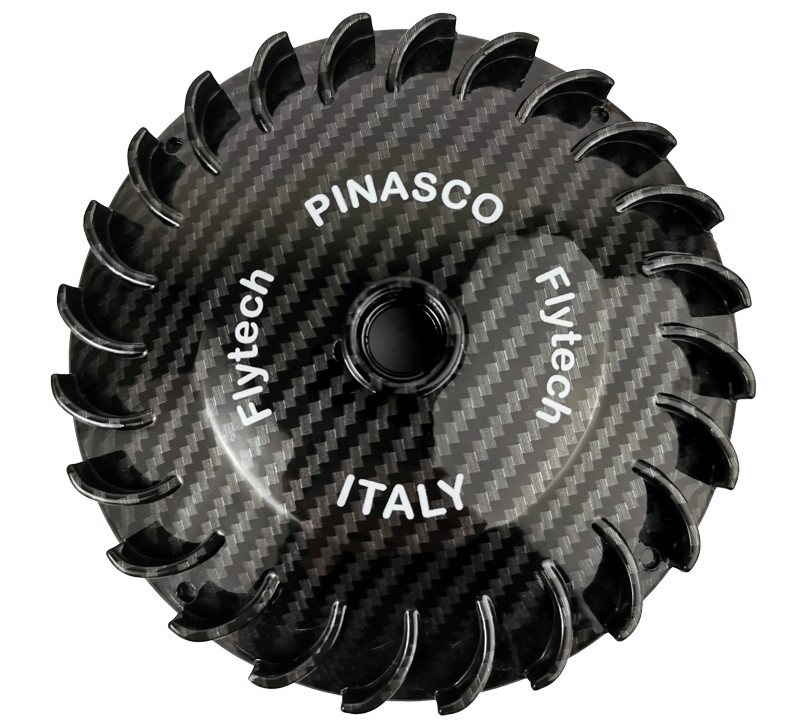 Il nuovo volano Moped Pinasco viene rivestito e verniciato con effetto "Carbon Look".